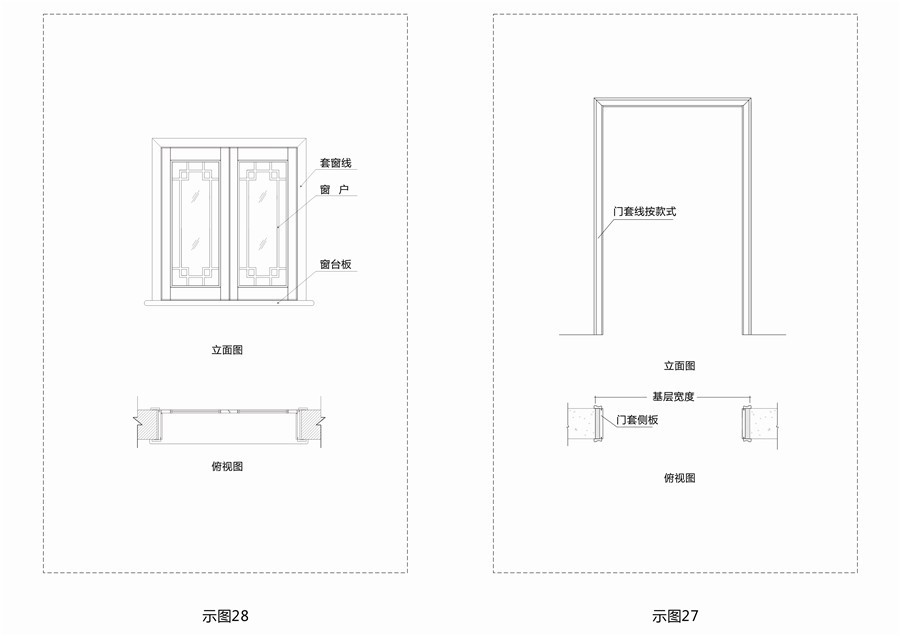 7.窗套:沿窗洞包墙的饰面板。分为带窗台板和不带窗台板。(示图28)
